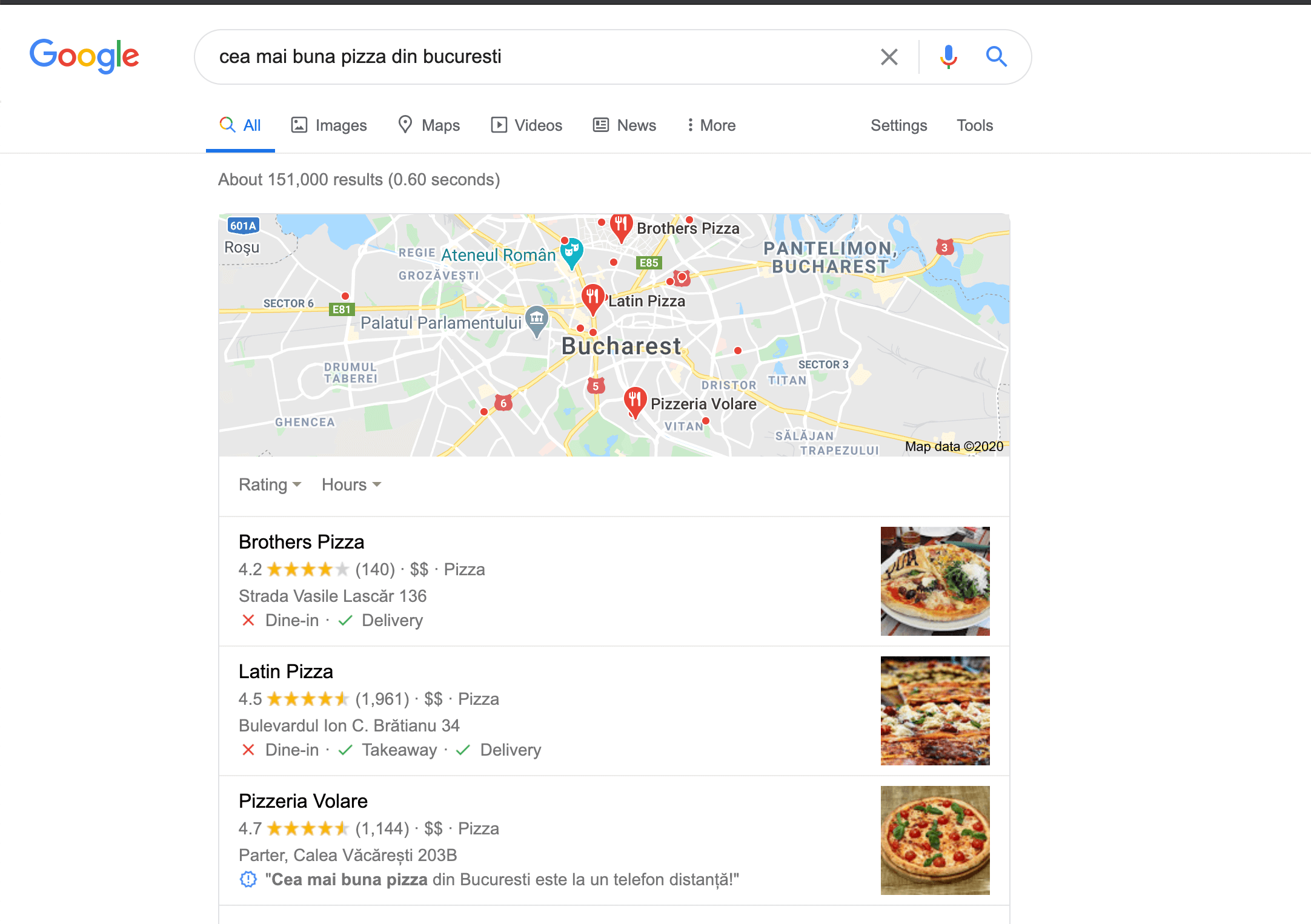 Sa presupunem ca vei cauta „cea mai buna pizza din Bucuresti” pe Google.